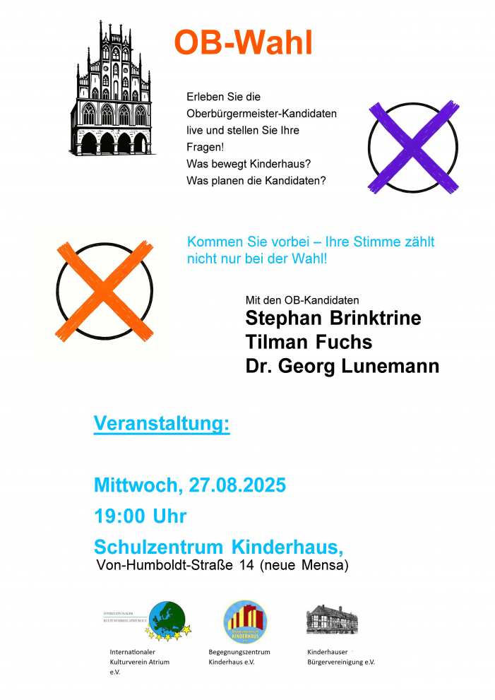 Alle Kinderhauser Bürger_innen – aber nicht nur die – sind herzlich eingeladen, Stephan Brinktrine, Tilman Fuchs und Dr. Georg Lunemann ab 19:00 Uhr in der (neuen) Mensa des Schulzentrums Geschwister-Scholl, Von-Humboldtstraße 14 zu befragen. Eine gemeinsame Veranstaltung von Internationalem Kulturverein Atrium e.V., Begegnungszentrum Kinderhaus e.V. und Kinderhauser Bürgervereinigung e.V.
